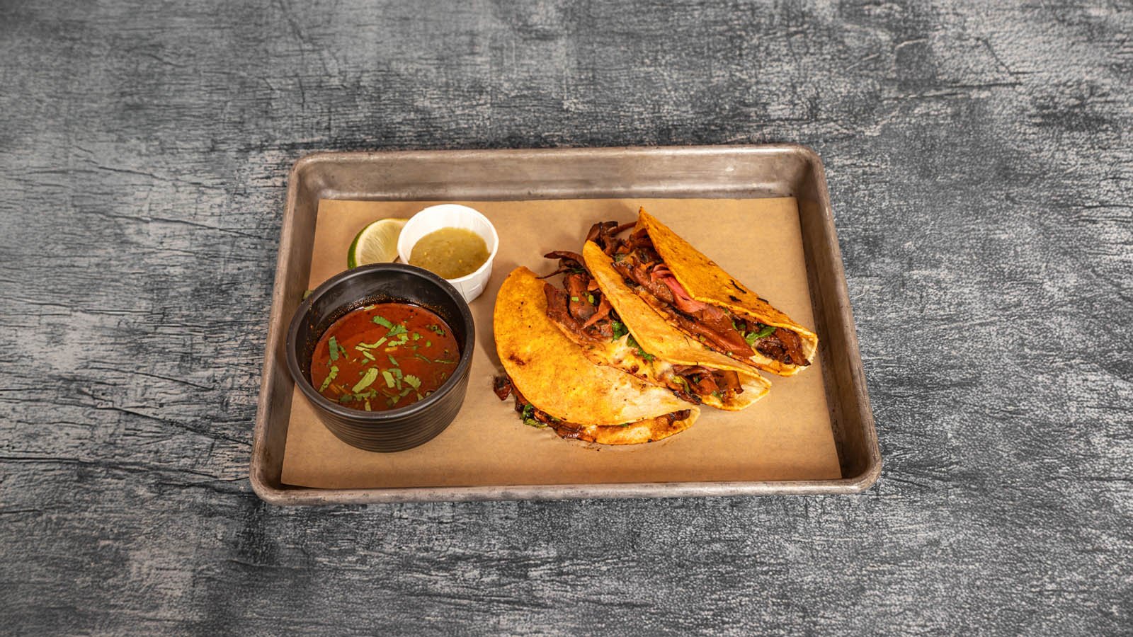 Juicy mushroom and cheese tacos served with spicy consomé and Salsa Verde