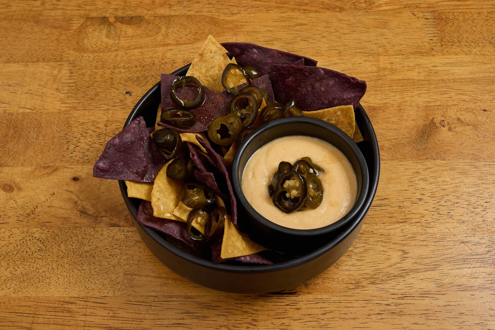 Tortilla chips with hot cheese sauce and candied Jalapeños
